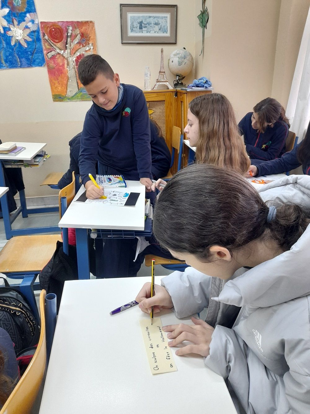 Οι μαθητές και οι μαθήτριες της ΣΤ’ Τάξης του Δημοτικού Σχολείου μας καλωσόρισαν το φθινόπωρο στα γαλλικά! Με τη συνδρομή των καθηγητριών της γαλλικής γλώσσας, κ.Ελισάβετ Λαφάρα και κ.Αμαλίας Λιάκου, συζήτησαν για τις αλλαγές του καιρού και για τις δραστήριότητές μας αυτήν την όμορφη περίοδο του χρόνου! Στη συνέχεια, έγραψαν στα γαλλικά προτάσεις που περιγράφουν τις φθινοπωρινές μας συνήθειες, ζωγράφισαν ανάλογες εικόνες και δημιούργησαν μ’ αυτές έναν όμορφο πίνακα,για να στολίσουν τον χώρο του Σχολείου. Τέλος, διασκέδασαν παίζοντας παιχνίδια λέξεων σχετικών με το φθινόπωρο.