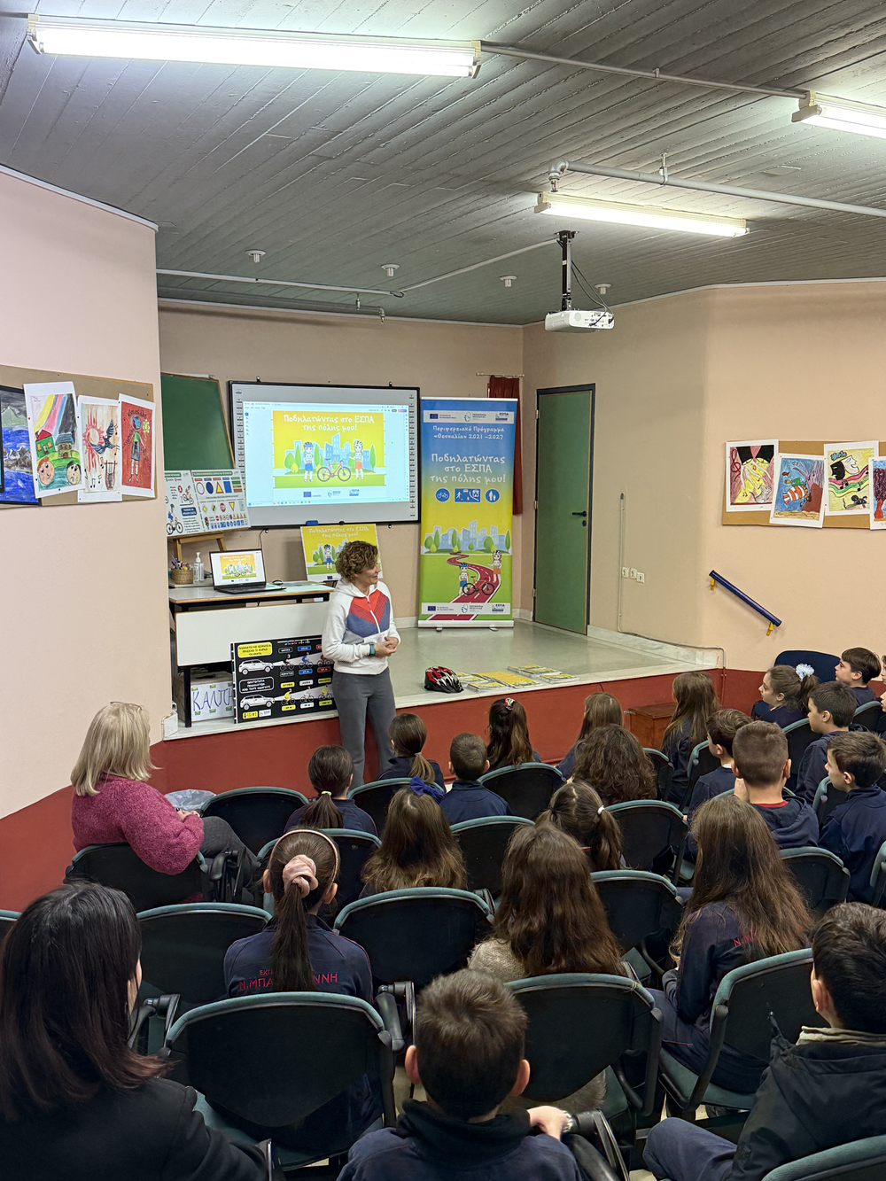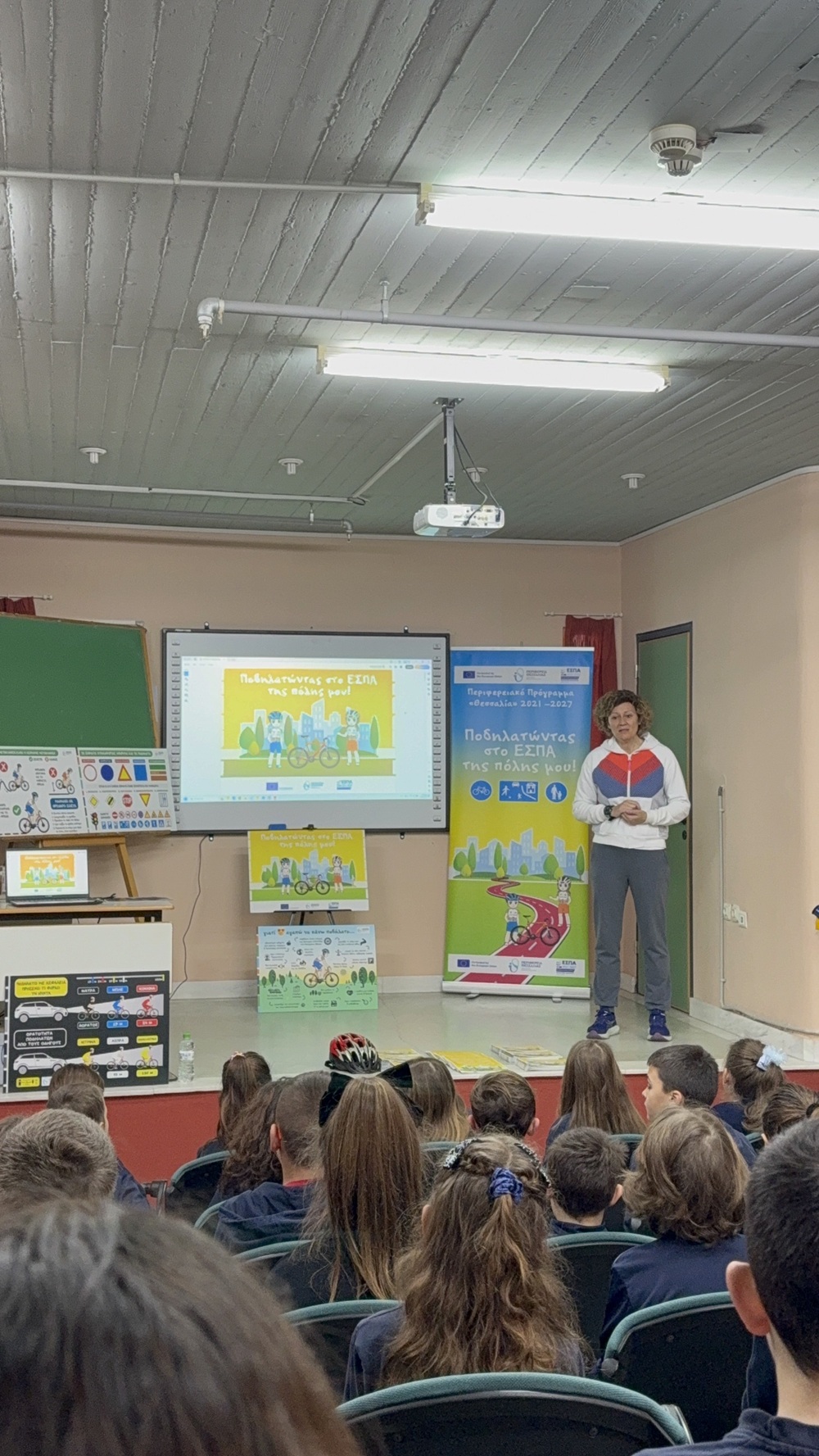 Στο εκπαιδευτικό πρόγραμμα “Ποδηλατώντας στο ΕΣΠΑ της πόλης μου”, που υλοποιείται από την Περιφέρεια Θεσσαλίας με τη συμβολή της Ευρωπαϊκής Χρηματοδότησης συμμετείχαν την Πέμπτη 27 Φεβρουαρίου 2025 οι μαθητές και οι μαθήτριες της Γ’ Τάξης του Δημοτικού Σχολείου μας. Μέσα από την παρουσίαση φωτογραφικού υλικού και προβολή βίντεο στο Αμφιθέατρο τα παιδιά γνώρισαν σε μία πρώτη προσέγγιση τους κανόνες για την ασφαλή χρήση και μετακίνηση με το ποδήλατο. Συζήτησαν με την υπεύθυνη του προγράμματος, κ. Ευαγγέλου Εύη, διατύπωσαν απορίες και σκέψεις και κατανόησαν την έννοια της βιώσιμης αστικής ανάπτυξης. Κατόπιν, στην ειδικά διαμορφωμένη αυλή του Σχολείου, εξασκήθηκαν βιωματικά σε βασικές δεξιότητες χρήσης του ποδηλάτου και στην ασφαλή μετακίνηση με αυτό στο αστικό περιβάλλον. Ήταν μία ξεχωριστή εμπειρία για τα παιδιά που την απόλαυσαν ιδιαίτερα!