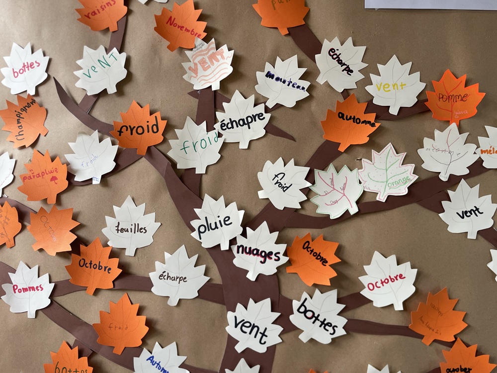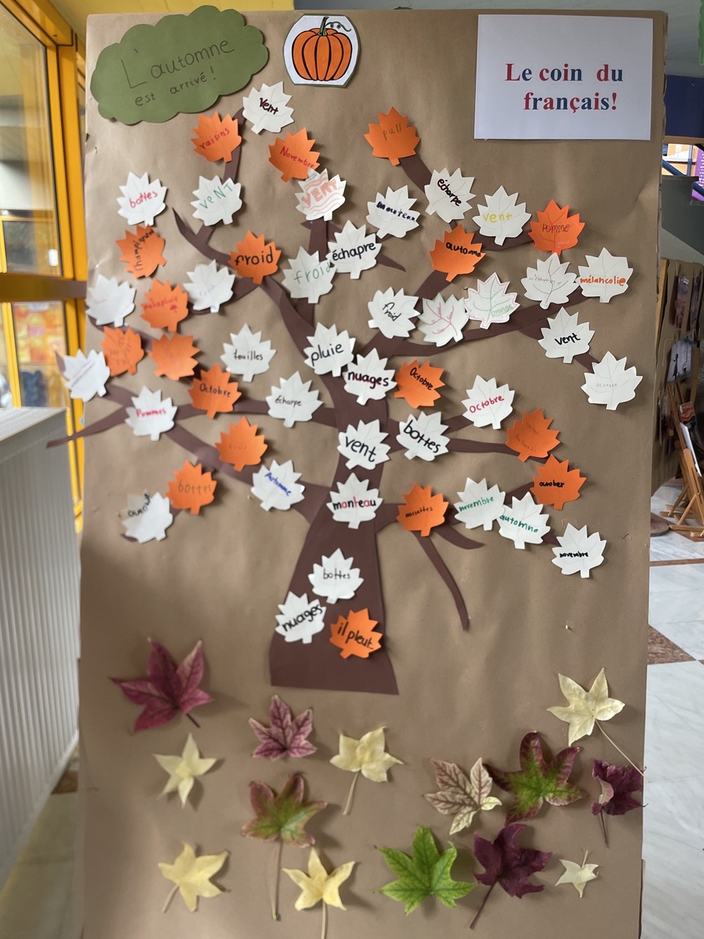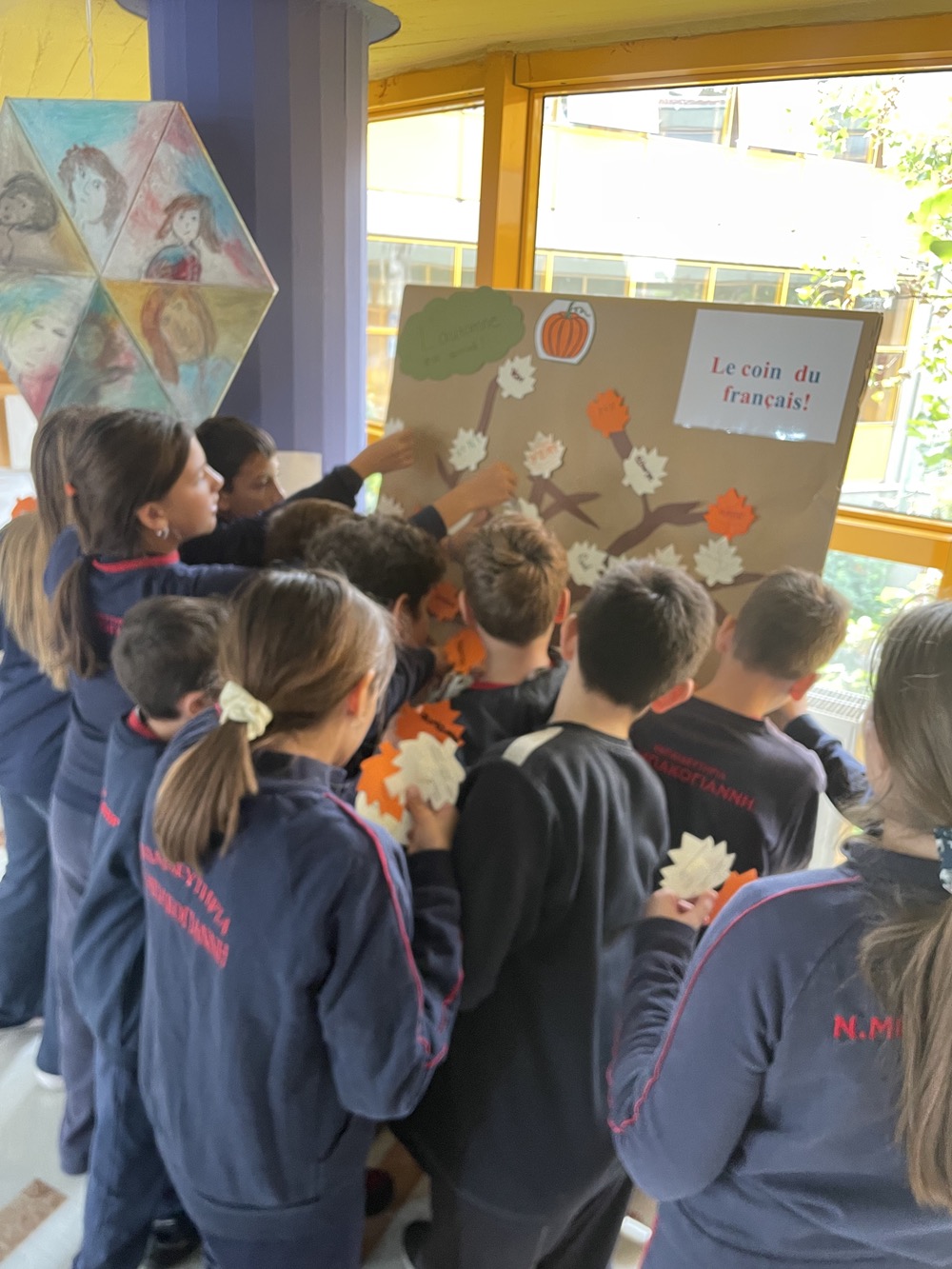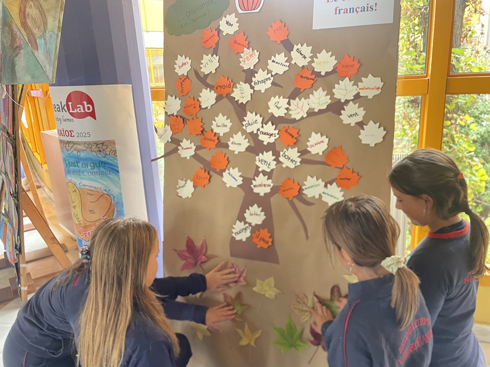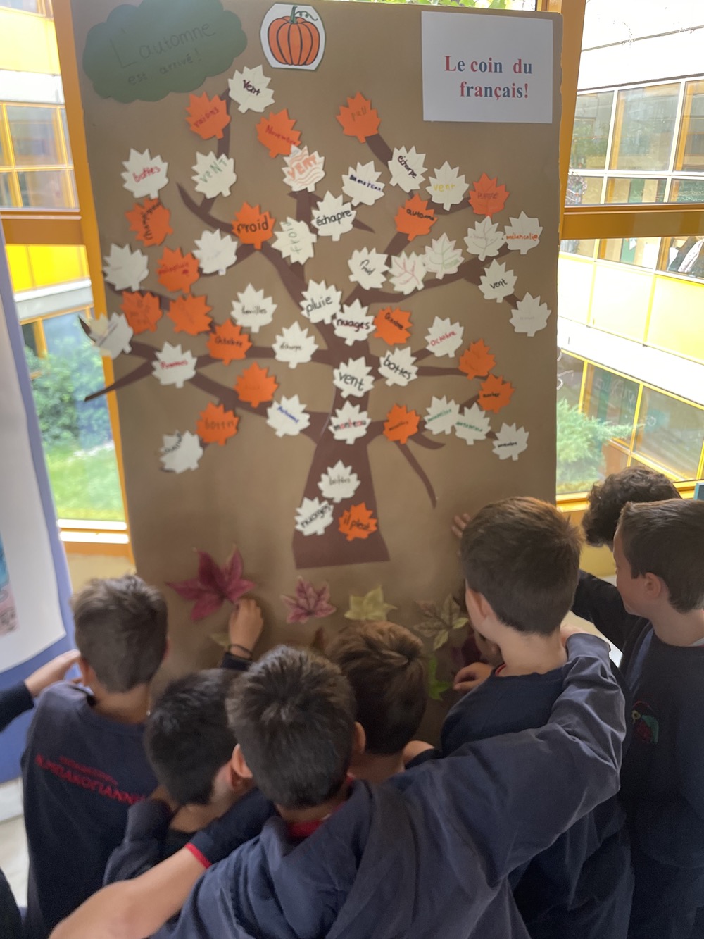 Οι μαθητές και οι μαθήτριες της ΣΤ´ Τάξης του Δημοτικού Σχολείου των Εκπ. Ν. Μπακογιάννη καλωσόρισαν το φθινόπωρο στα γαλλικά! Με τη συνδρομή των καθηγητριών της Γαλλικής Γλώσσας έψαξαν και βρήκαν λέξεις που αφορούν αυτήν την όμορφη περίοδο του χρόνου: «automne, pluie, feuilles, bottes, marrons…” Στη συνέχεια, τις έγραψαν πάνω σε φυλλαράκια και με αυτά στόλισαν το δέντρο που κοσμεί τη σάλα του Σχολείου. Τέλος, με ενθουσιασμό μάζεψαν αληθινά φύλλα από τα δέντρα της αυλής μας για να δώσουν μια πιο ρεαλιστική εικόνα στη δημιουργία τους!