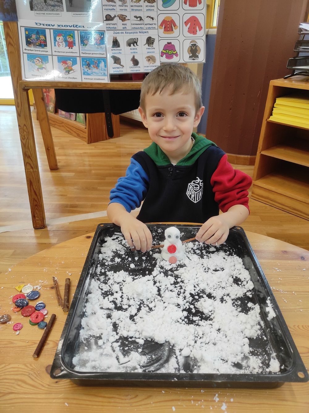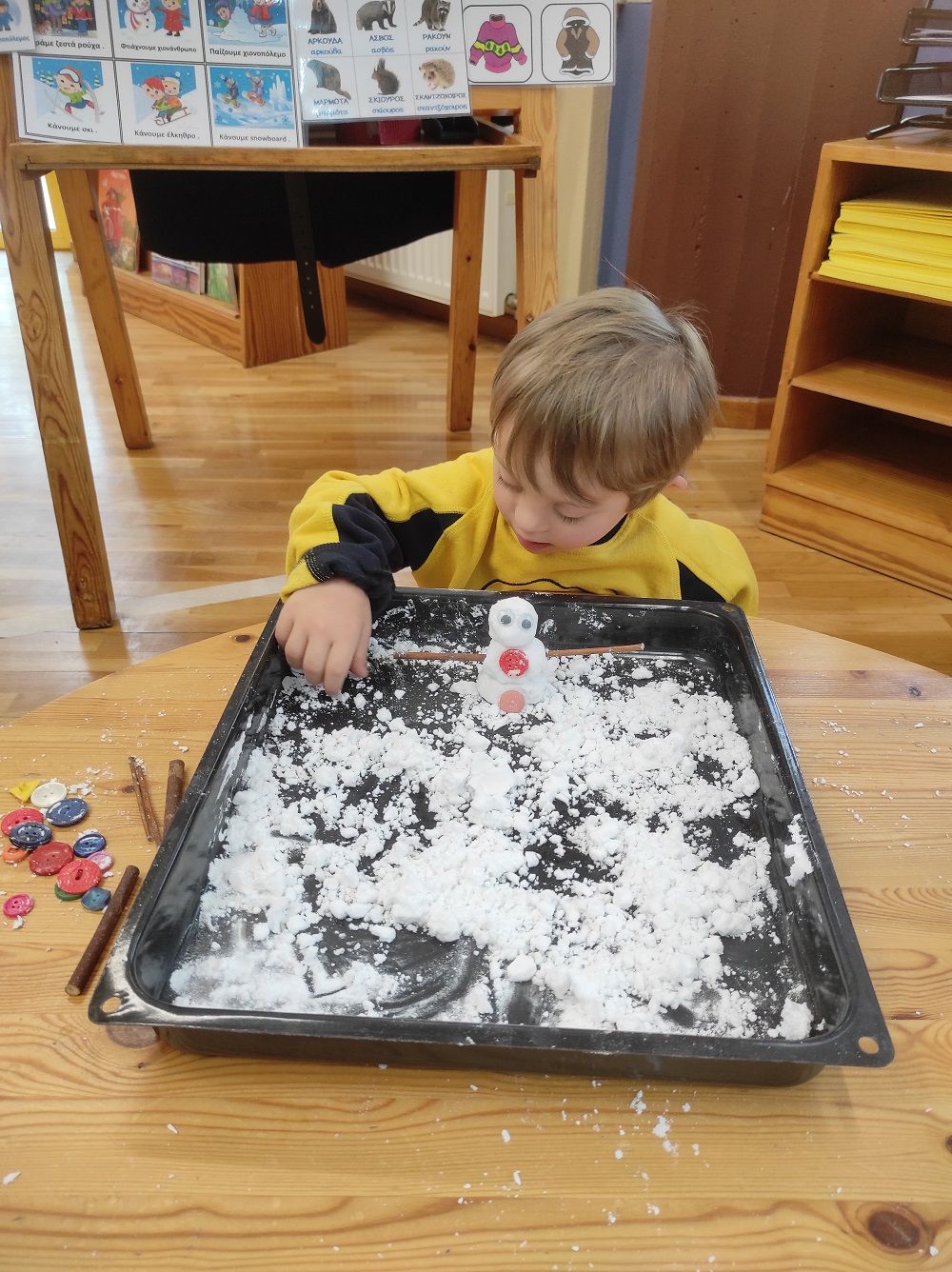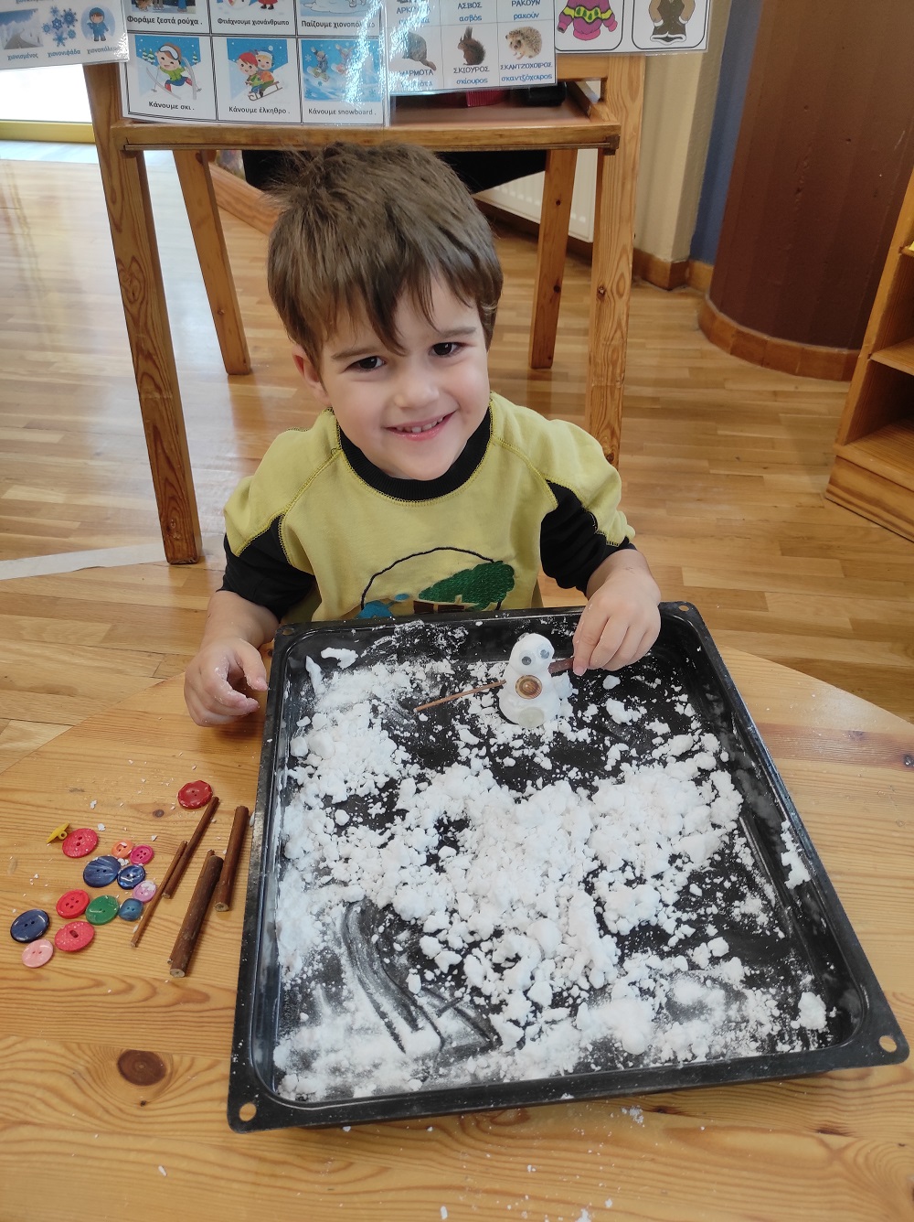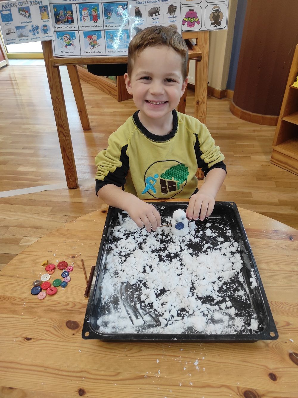 Τα τμήματα του Παιδικού Σταθμού υποδέχτηκαν τον χειμώνα  με χαρά και μέσα από ποικίλες δράσεις και βιωματικά παιχνίδια οι μικρόι/ ές μαθητές/τριες αντιλήφθηκαν τις αλλαγές που επιφέρει ο χειμώνας. Πιο αναλυτικά, γνώρισαν μέσω του διαδραστικού πίνακα τις εναλλαγές του καιρού, τους μήνες, τα ρούχα που χρησιμοποιούμε τον χειμώνα αλλά και την έννοια της χειμερίας νάρκης της φύσης και των ζώων. Γεύτηκαν χειμερινά φρούτα, εξάσκησαν τη λεπτή κινητικότητα «ταΐζοντας» χιονάνθρωπο, βοηθώντας τη χιονονιφάδα να φτάσει στην γη με την ευθεία κάθετη γραμμή αλλά και παίζοντας στο παγοδρόμιο. Δημιούργησαν χιόνι με μαγειρική σόδα και αφρό ξυρίσματος και στη συνέχεια κατασκεύασαν  το δικό τους  χιονάνθρωπο. Μεταμορφώθηκαν σε μικούς Πικάσο σχεδιάζοντας πολική αρκούδα. Δοκίμασαν τις ικανότητές τους στο σκι και αντιστοίχισαν πιγκουινάκια με ψαράκια βάσει χρώματος. Από αυτό το «ταξίδι» αντιλήφθηκαν τη μοναδικότητα και την ομορφιά του χειμώνα.