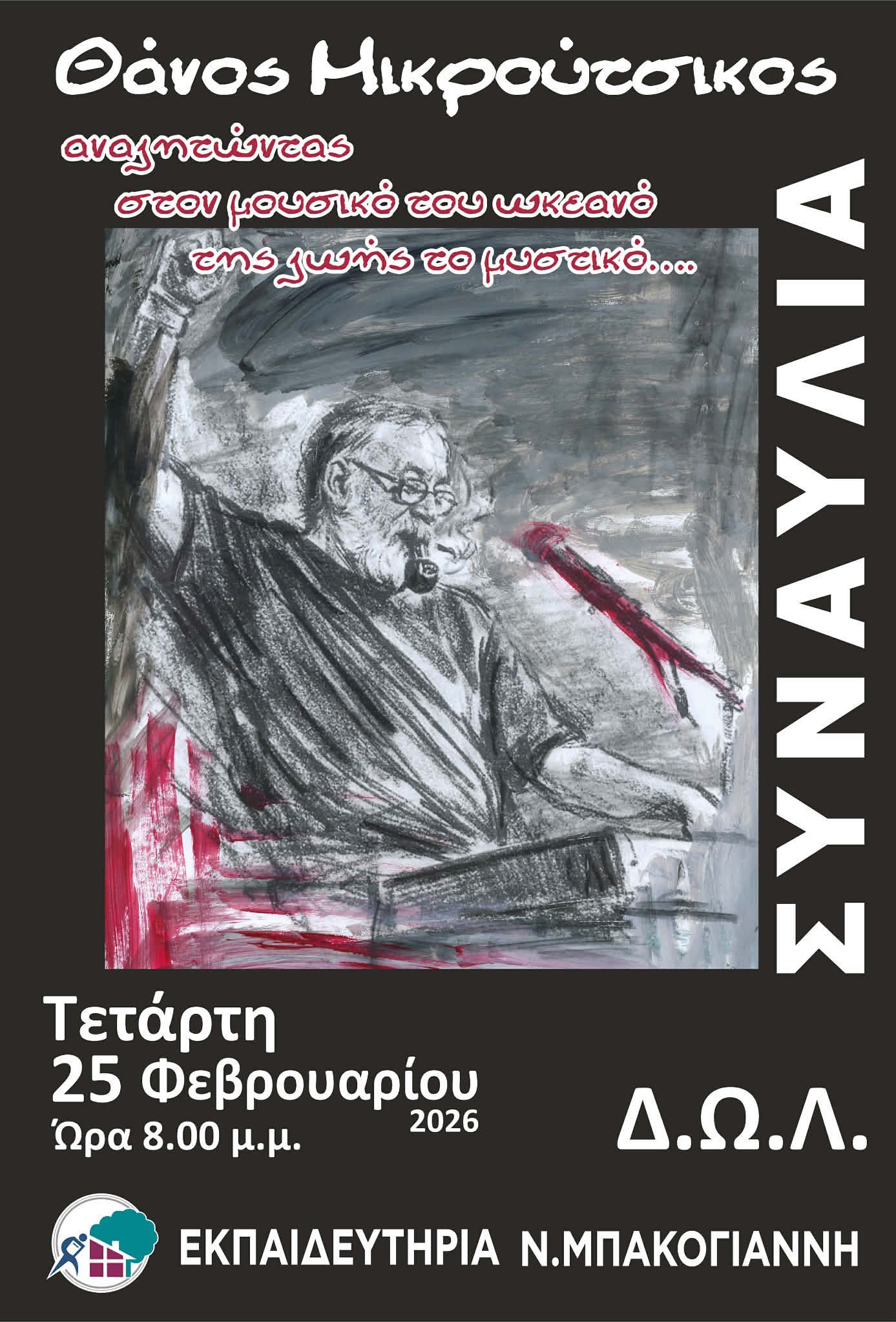 Τα Εκπαιδευτήρια Ν. Μπακογιάννη διοργανώνουν την Τετάρτη 25 Φεβρουαρίου 2026 και ώρα 20:00, στην αίθουσα Εκδηλώσεων του Δημοτικού Ωδείου Λάρισας, εκδήλωση αφιερωμένη στον κορυφαίο μουσικοσυνθέτη, διανοητή, αμετανόητα γενναιόδωρο και ισόβιο ακόλουθο της εφηβείας, Θάνο Μικρούτσικο, τον συνθέτη που μέσα από το έργο του μας καλεί αενάως και με ασίγαστο πάθος σε μια διαρκή υπέρβαση των ορίων για την κατάκτηση του αδύνατου, έναν δημιουργό που με το πολυσχιδές έργο του σφράγισε τη σύγχρονη ελληνική δημιουργία και συνεχίζει να εμπνέει τις νέες γενιές για να «μπορούν να χορεύουν πάνω στο φτερό του καρχαρία».